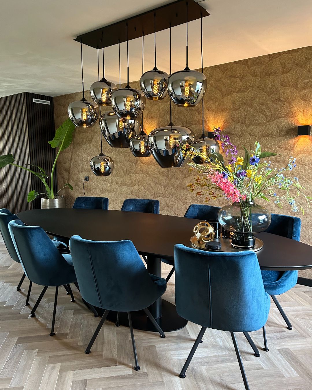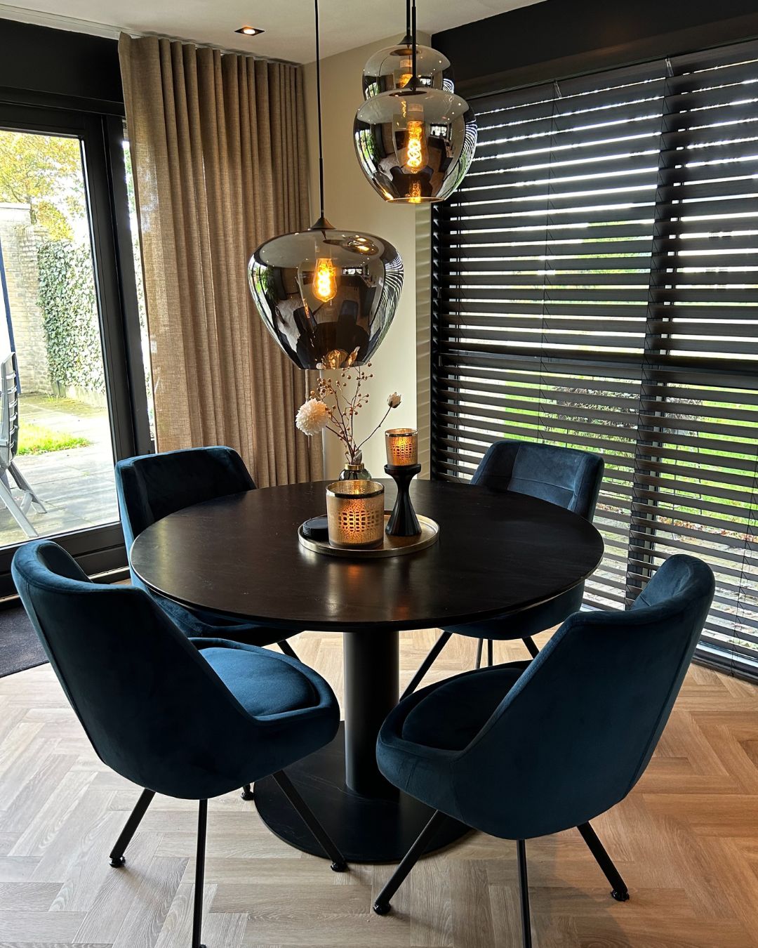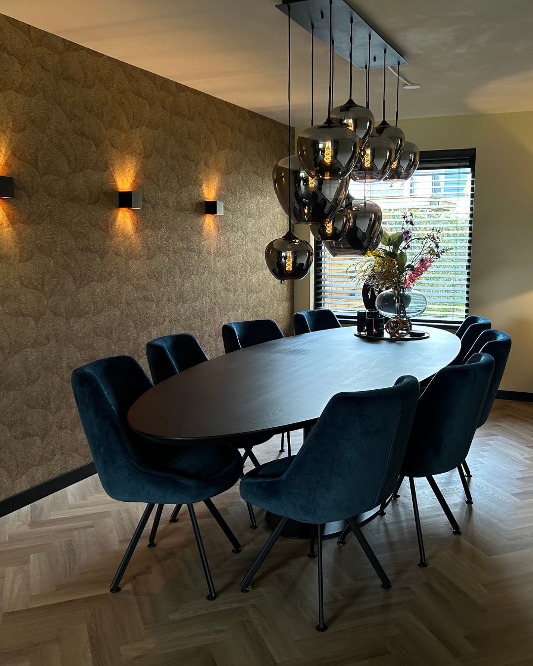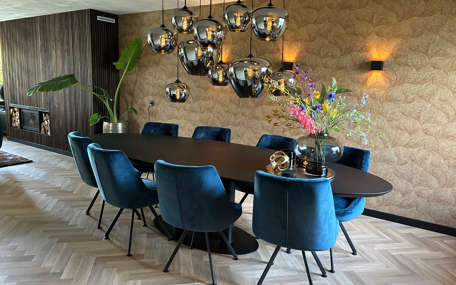 In deze woning was er de mogelijkheid om twee eetkamers te creëren. Eén ruimte is ingericht als plek om gezellig te borrelen met vrienden en familie, de andere eetkamer is perfect voor lange, sfeervolle diners met het gezin. Door het gebruik van donkere kleuren, goudaccenten en rijke materialen heeft elke eetkamer een chique en luxe sfeer gekregen die perfect past binnen de Hotel Chique sfeer.