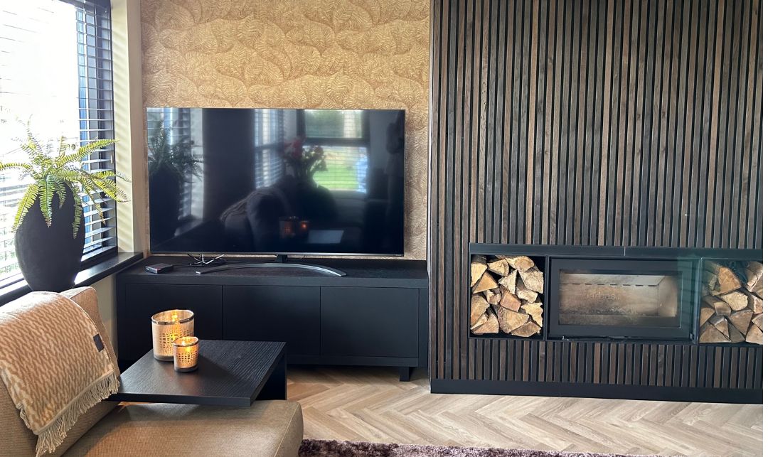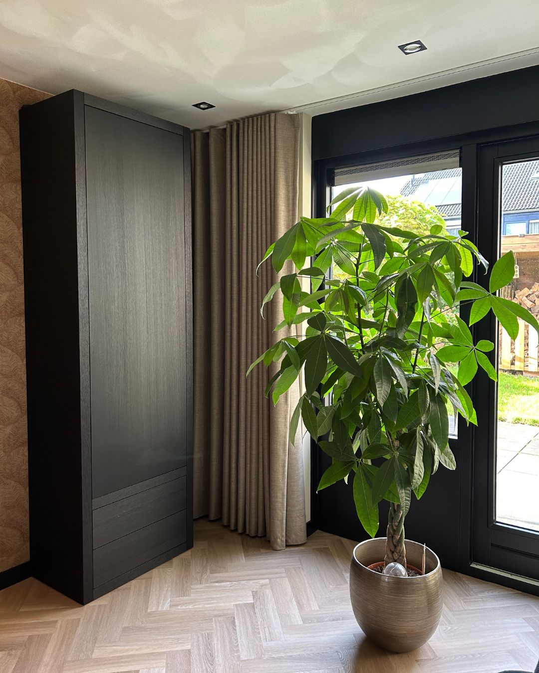 De wens voor een sfeervol en gezellig interieur in Hotel Chique stijl is ook in de woonkamer doorgetrokken. Hier zijn donkere tinten gecombineerd met goudaccenten en luxe accessoires, wat zorgt voor een elegante en uitnodigende uitstraling. Comfortabele meubels en zorgvuldig gekozen details maken de ruimte compleet en creëren een warm en harmonieus geheel.