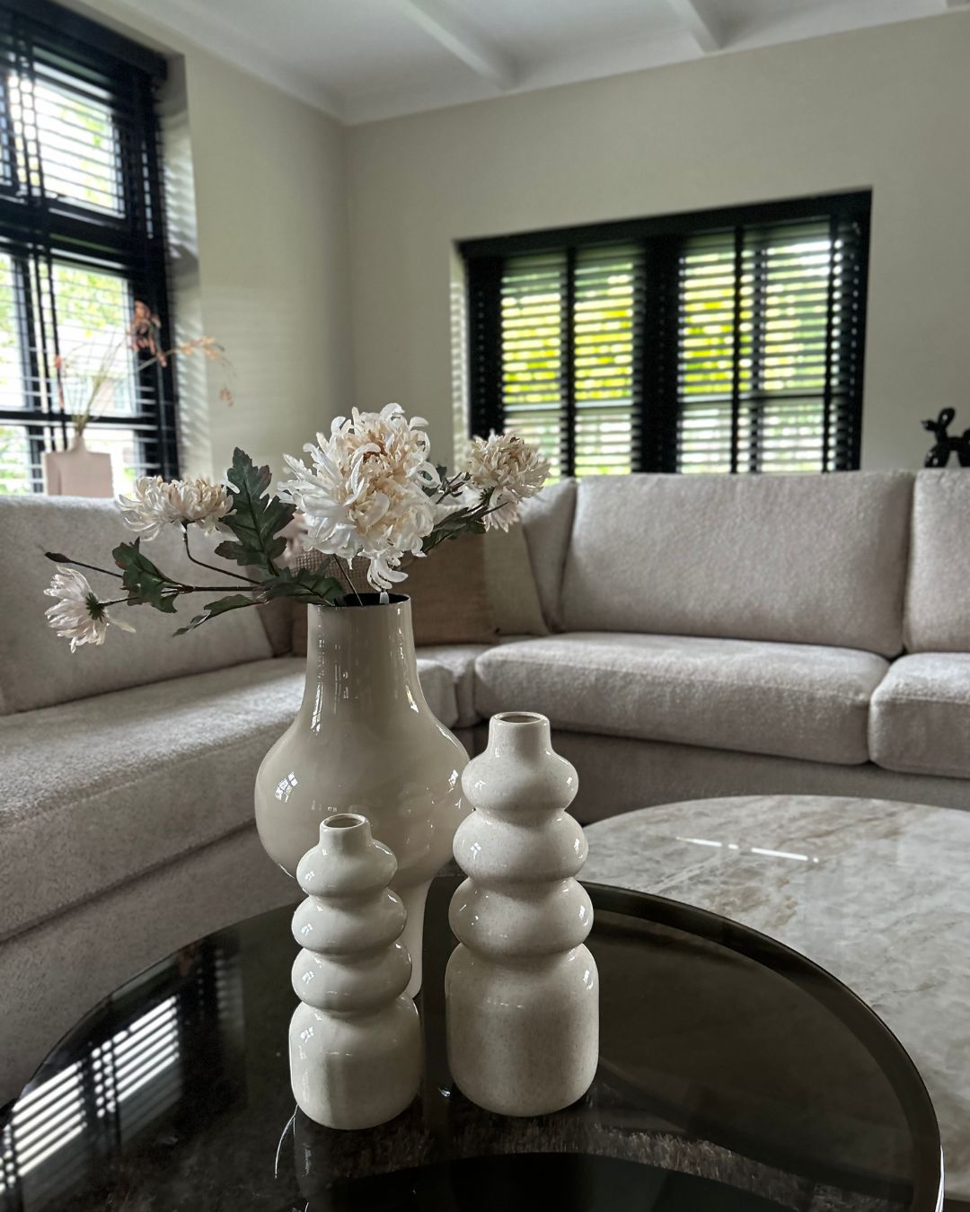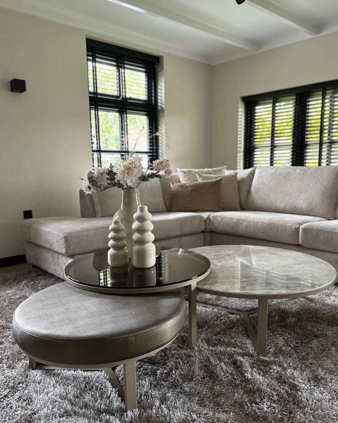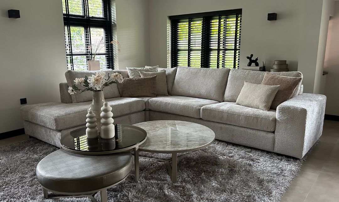 We hebben gekozen voor frisse, lichte kleuren die de woning een fijne en rustgevende uitstraling geven. De woonkamer is ingericht met een royale hoekbank van Olav Home, perfect om samen te ontspannen. In het middelpunt staat een prachtige set salontafels van Duran Interiors, die direct een stijlvolle en luxe sfeer toevoegen aan de ruimte.