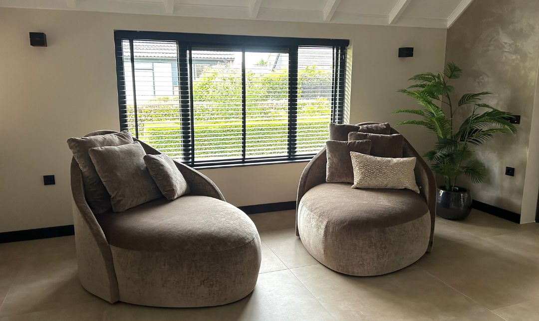 Een bijzonder en vooral rustgevend hoekje in de woonkamer wordt gevormd door twee Toya lounge fauteuils van Passe Partout. Deze comfortabele fauteuils zijn niet alleen een heerlijk om in te zitten, maar geven het interieur ook direct een luxe en chique uitstraling. Een perfecte plek om te relaxen.