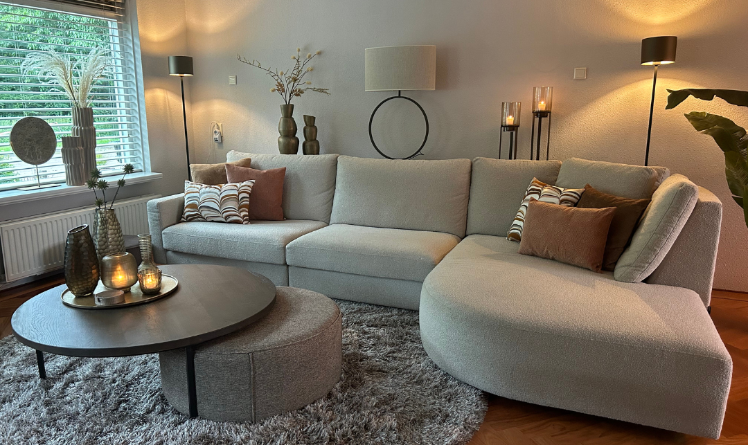 In de woonkamer is de hoekbank Avelino van Passe Partout geplaatst. Deze heeft een combinatie van zowel strakke als organische vormen. Dit geeft direct een frisse uitstraling, terwijl de ruimte warm en sfeervol blijft. Overal in het interieur komen ronde en organische vormen terug: van het vloerkleed en de salontafels tot de lampen en de prachtige accessoires. Zo ontstaat een samenhangend geheel dat zowel stijlvol als huiselijk aanvoelt.