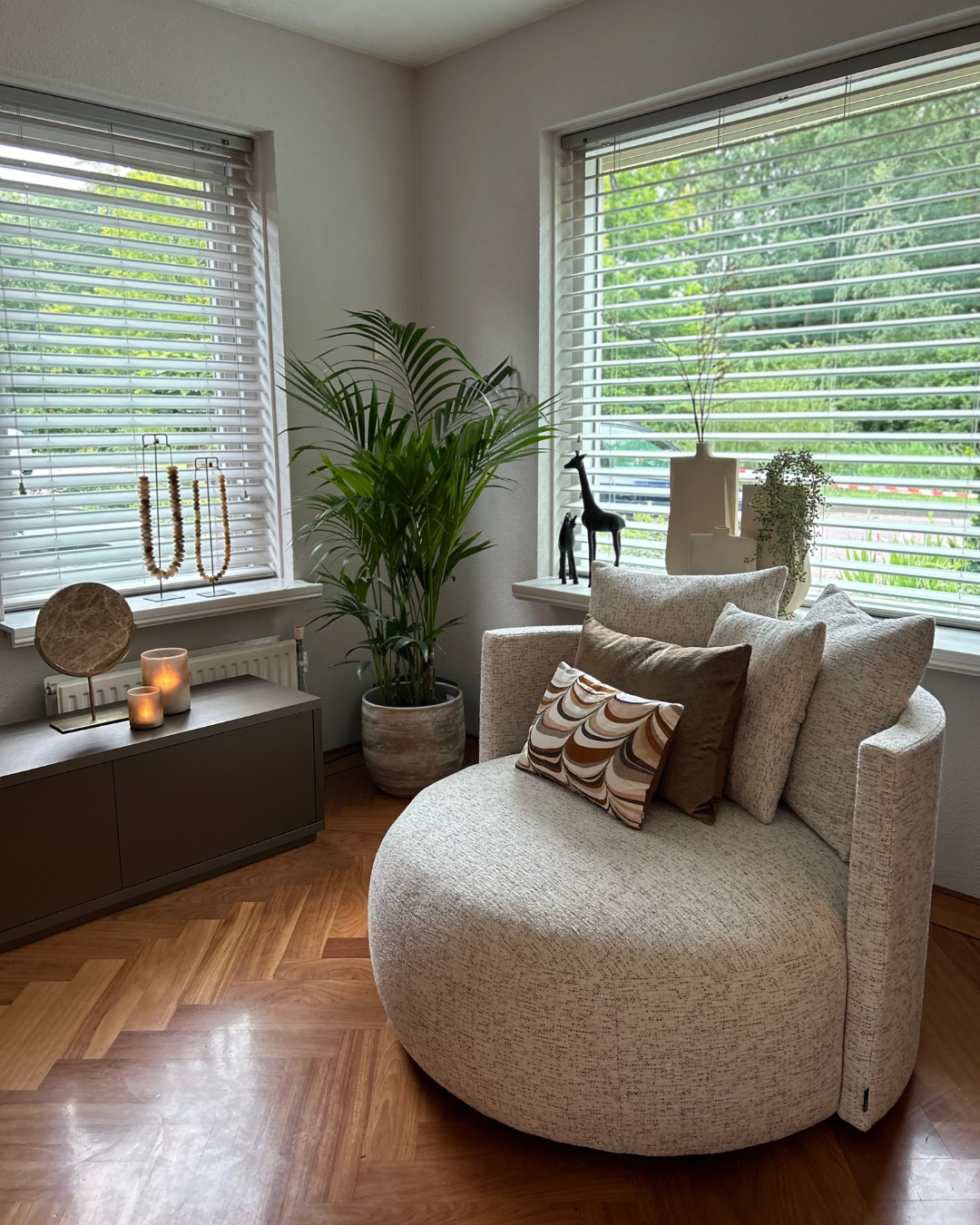 In een hoekje van de woonkamer is een Pastille draaifauteuil van Passe Partout geplaatst. Deze comfortabele fauteuil nodigt uit om even te ontspannen, een boekje te lezen of een kopje koffie te drinken. Samen met de accessoires vormt dit hoekje een sfeervol en uitnodigend plekje dat naadloos aansluit bij de organische lijnen in de rest van het interieur.