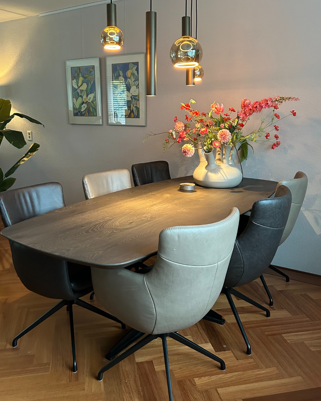 De eettafel heeft een Deens ovalen ontwerp met een elegante zwart metalen spinpoot. Rondom de tafel staan zes leren draaistoelen, die zowel stijl als comfort bieden. Het geheel wordt extra aangekleed met een vrolijk boeket in een opvallende vaas, dat de ruimte kleur en gezelligheid geeft.