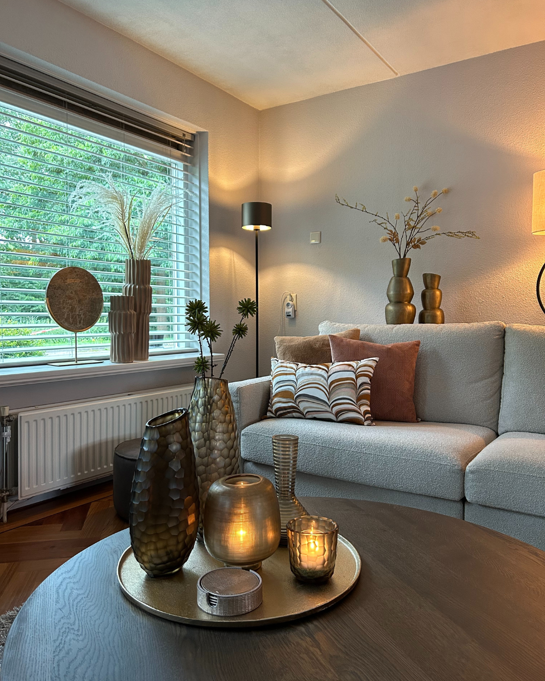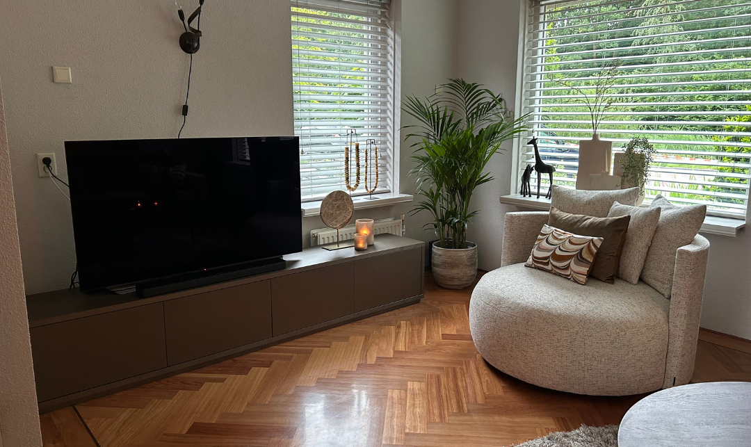 Onze styliste Daniëlle heeft beide ruimtes compleet afgestyled met zorgvuldig gekozen accessoires. Van kussens en vazen tot lampen en decoratie: alles draagt bij aan de warme, stijlvolle en organische uitstraling van het interieur. Zo ontstaat een harmonieuze balans tussen elegantie en huiselijke gezelligheid.