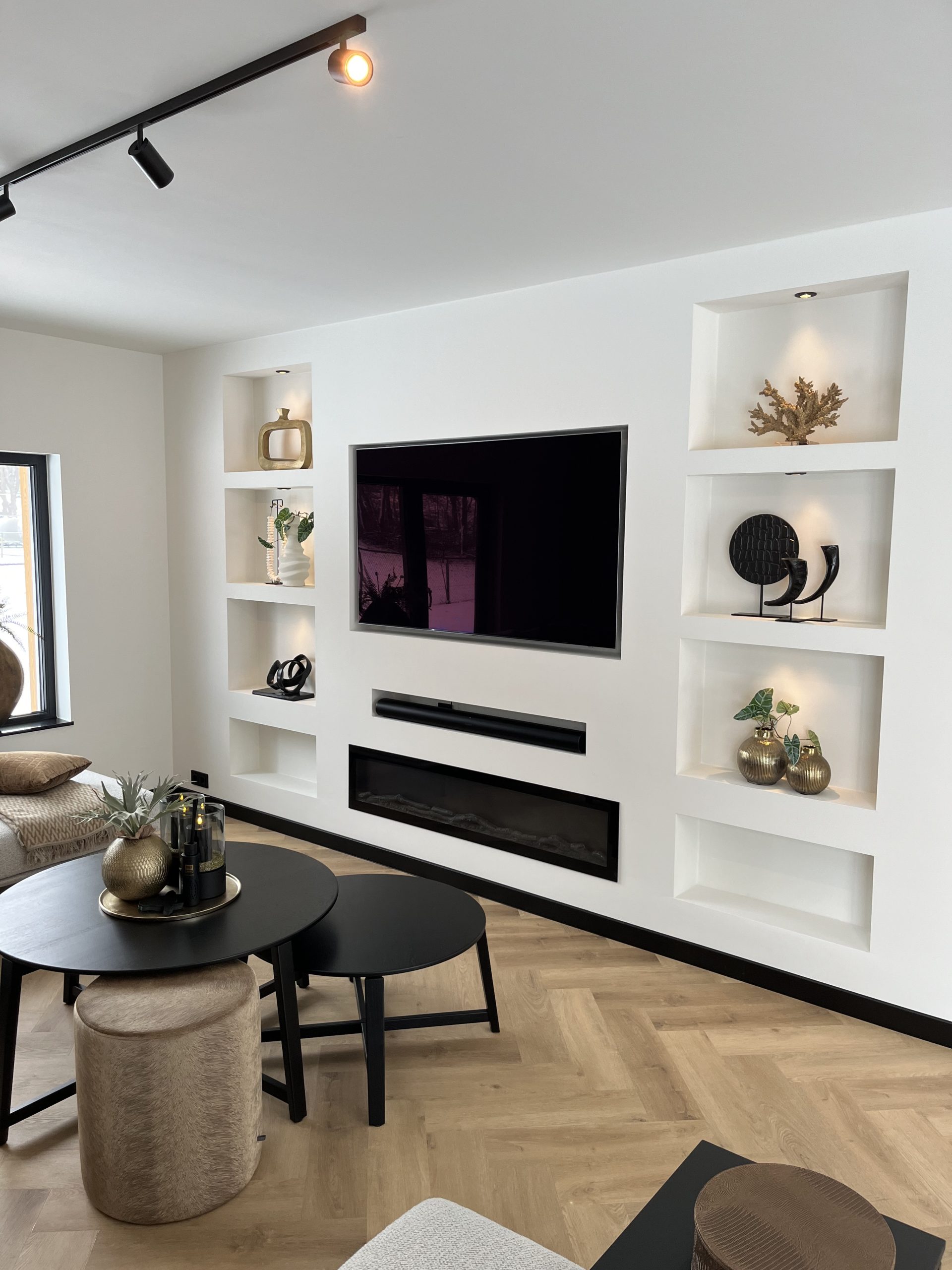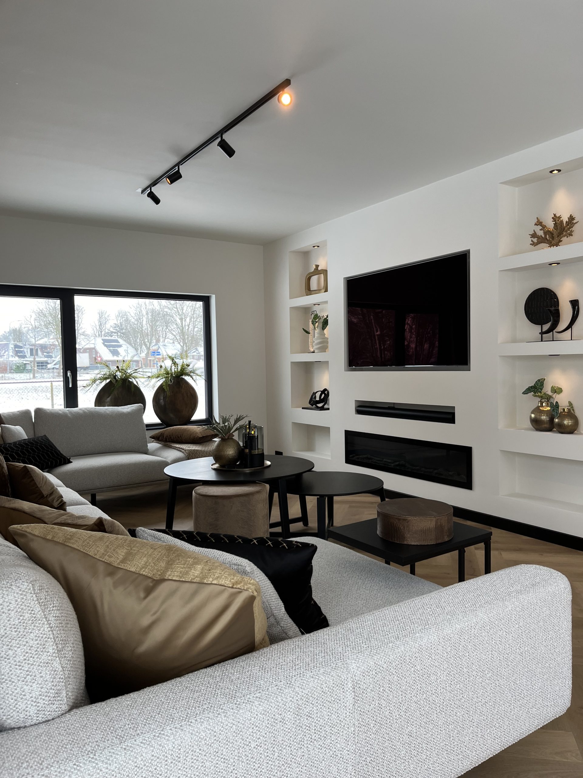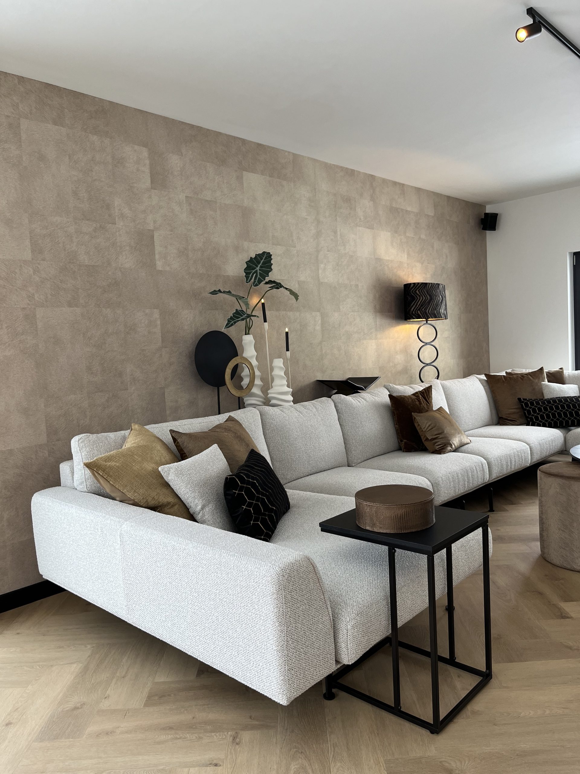Bij deze metamorfose van de woonkamer en keuken is gekozen voor een rustige basis van wit, beige en warme bruintinten. Deze neutrale kleuren zorgen voor een lichte en tijdloze uitstraling, terwijl ze tegelijkertijd warmte en sfeer toevoegen aan het interieur. Door hier en daar zwarte accenten toe te passen ontstaat er een subtiel contrast, waardoor het geheel meer diepte krijgt zonder de rust te verliezen.