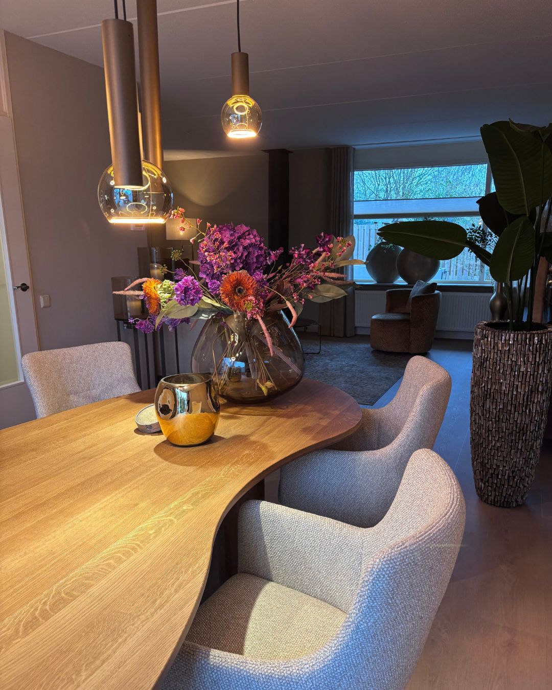 De eettafel van het merk Passe Partout vormt het middelpunt van de eetkamer. Dankzij de organische vorm van de tafel ontstaat een vloeiende, natuurlijke uitstraling die perfect bij het interieur past. In combinatie met bijpassende stoelen creëert dit een warme en stijlvolle plek om samen te dineren, borrelen of te werken. De organische vorm van de tafel is op dit moment helemaal in en volgen de huidige interieurtrends, waardoor de eetkamer zowel modern als gezellig aanvoelt. Door de aandacht voor detail en de luxe uitstraling van de tafel voelt de ruimte direct uitnodigend en sfeervol aan.
