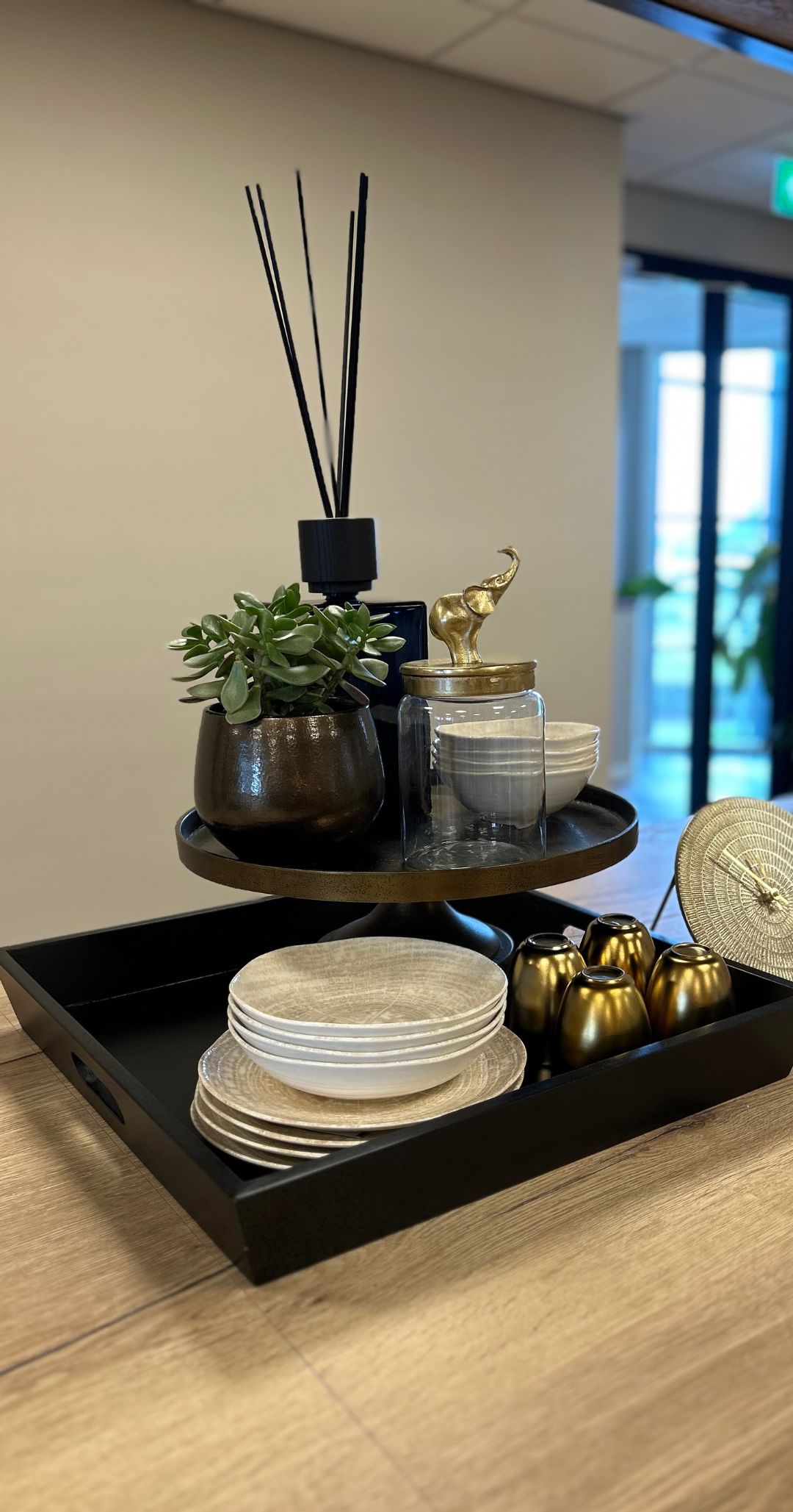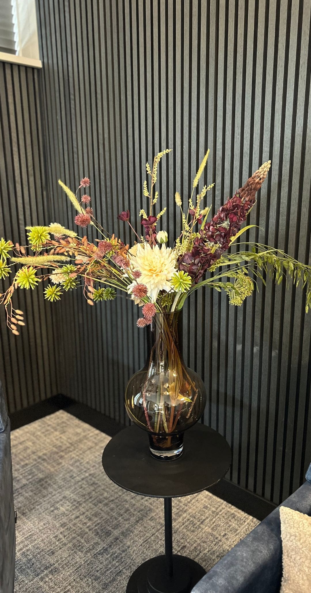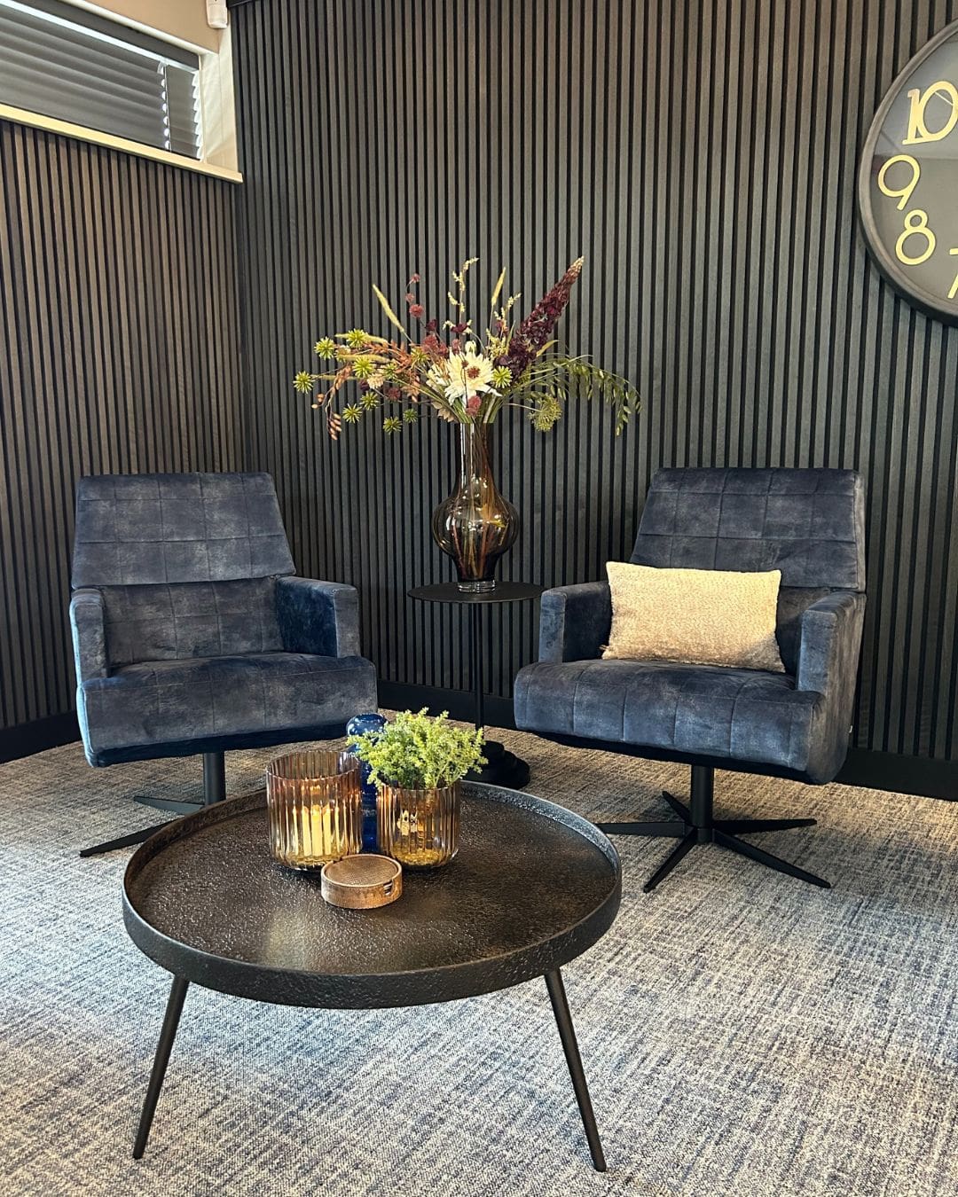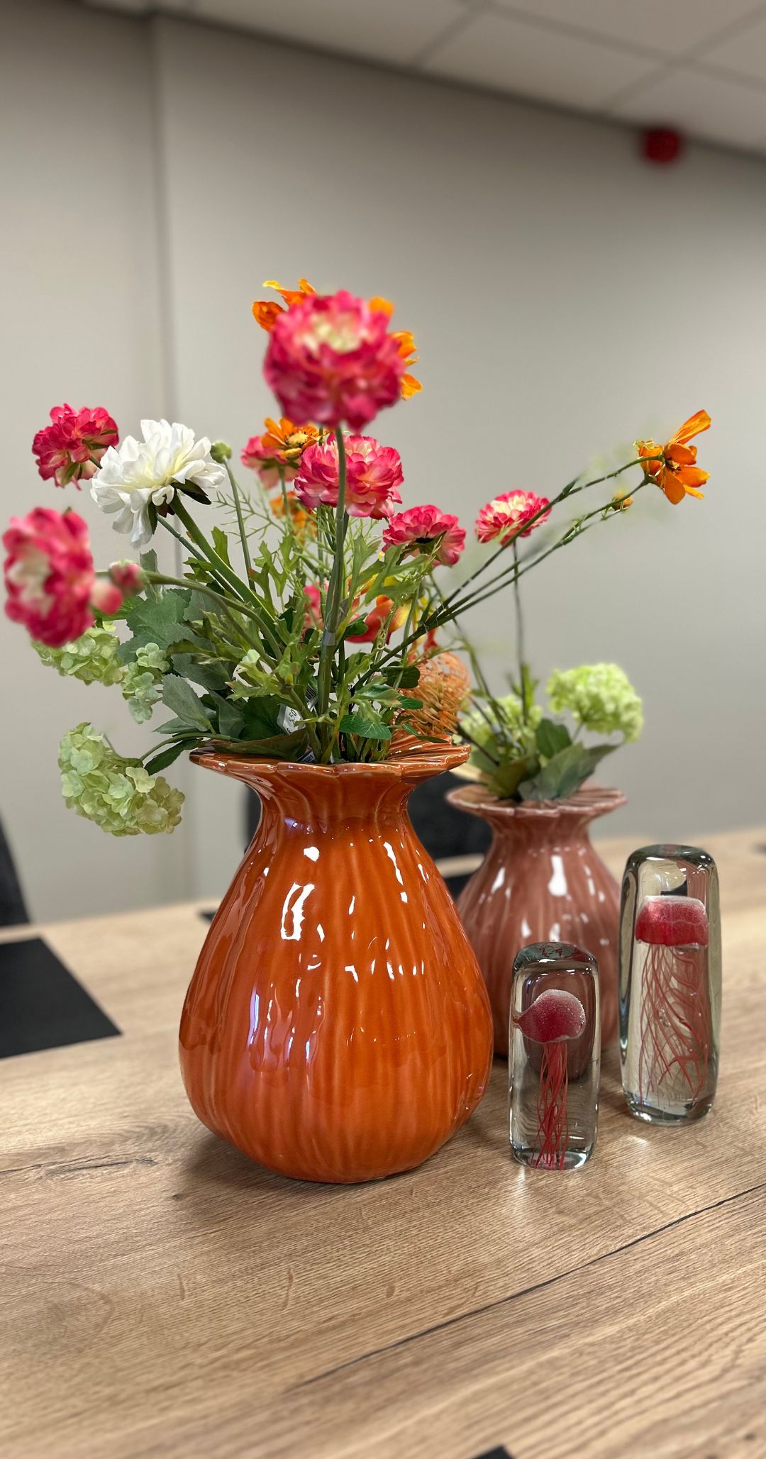 Het interieur werd volledig afgerond met een stijlvol zijdeboeket, samengesteld door onze styliste Riena. De rustige kleuren sluiten perfect aan bij de rest van de kantoorinrichting en geven de ruimte een harmonieuze uitstraling. Zo maken wij van elke bedrijfsruimte een sfeervol geheel.