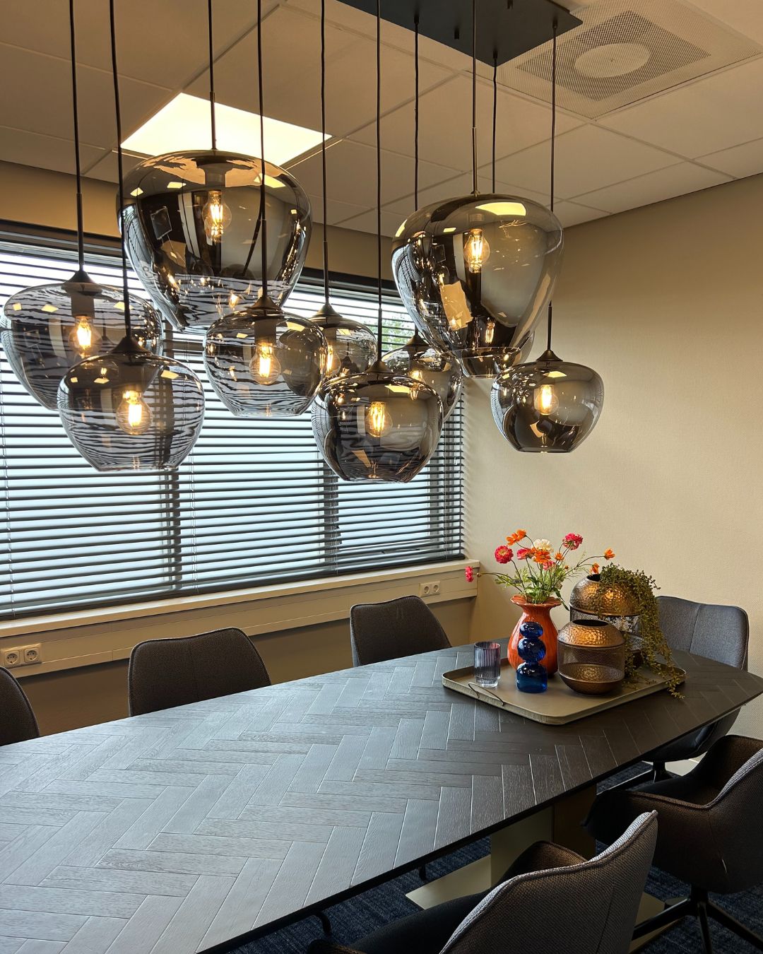 Een goed ingerichte vergaderruimte combineert comfort en stijl. Rond de maatwerk vergadertafel staan de comfortabele Kiq-stoelen van Bree’s New World, ideaal voor lange meetings. De hanglamp van Light & Living voegt direct sfeer en karakter toe. Zo zorgen wij ervoor dat vergaderruimtes praktisch én inspirerend zijn.