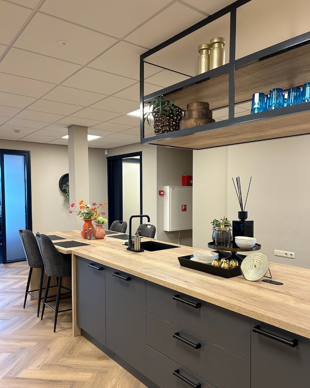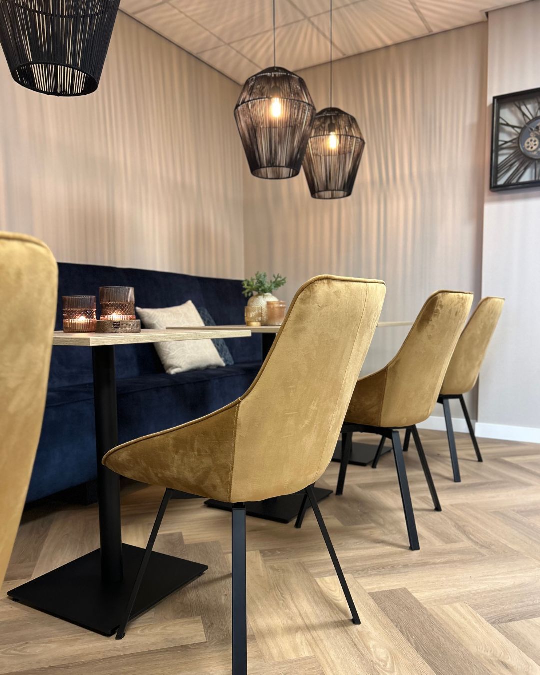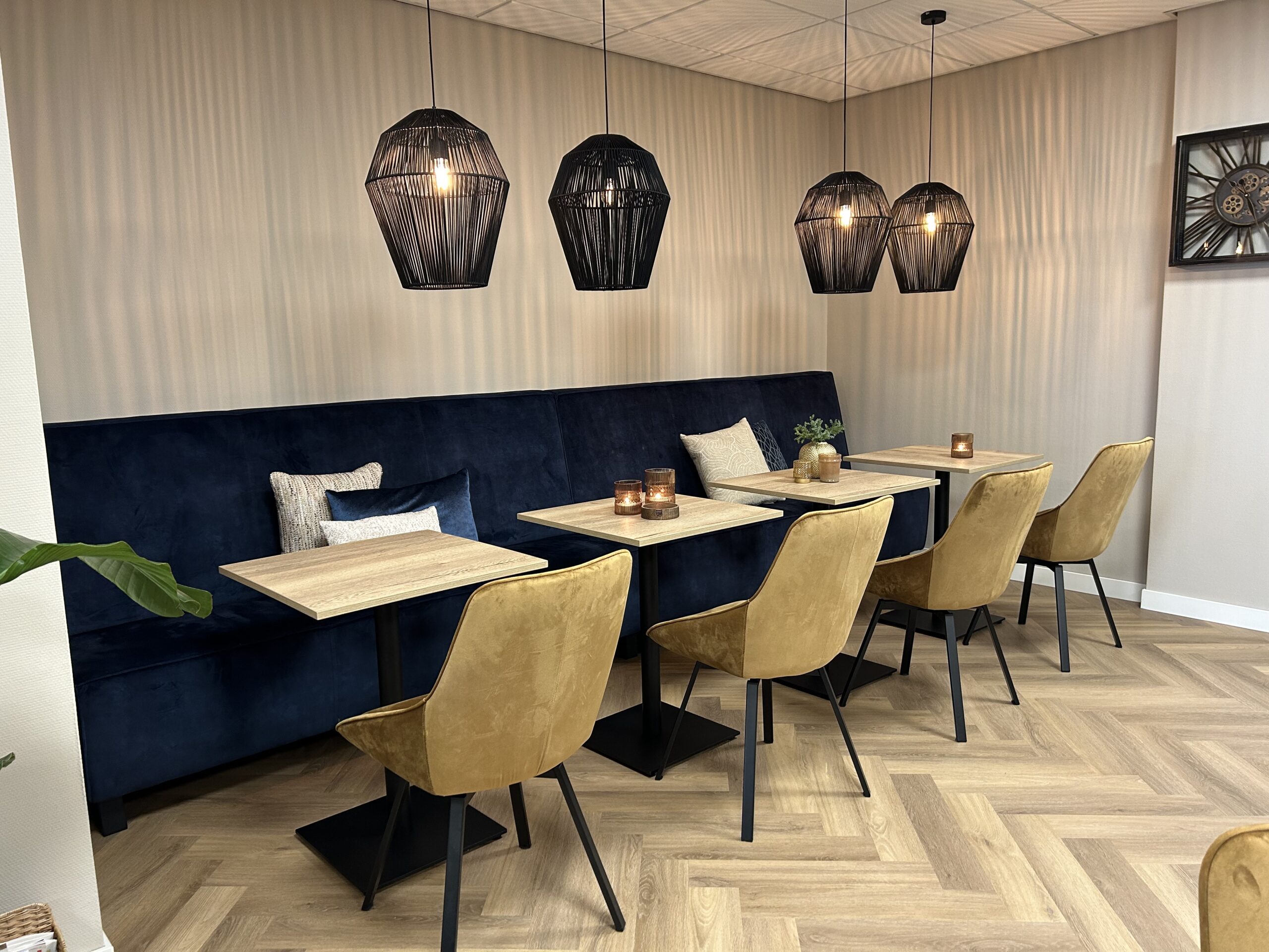 De kantine is ingericht met een luxe velours eetkamerbank van Sevn, model Jelle, in een blauwe tint die perfect aansluit bij de huisstijl van Admifa. In combinatie met de goudkleurige velours eetkamerstoelen van By Boo ontstaat een warme en uitnodigende sfeer. Accessoires zoals sierkussens, bloemen en de Wally’s van Pot & Vaas maken de kantine compleet.